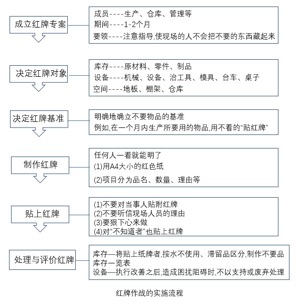 貼附的紅牌移往紅牌集中處后,應(yīng)予以記錄。將貼上紙牌者,按永不使用、滯留品區(qū)分,制作不要品庫存一覽表,對于設(shè)備-執(zhí)行改善之后,造成困擾阻礙時(shí),不以支持或廢棄處理。紅牌作戰(zhàn)看板流程具體細(xì)節(jié)內(nèi)容如上圖所示。